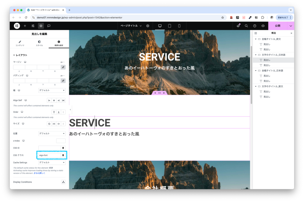 英語フォントを一括でCSSで編集出来るように、見出しが英語のウィジェットには、高度な設定のクラスに「eigo-font」を入れています。